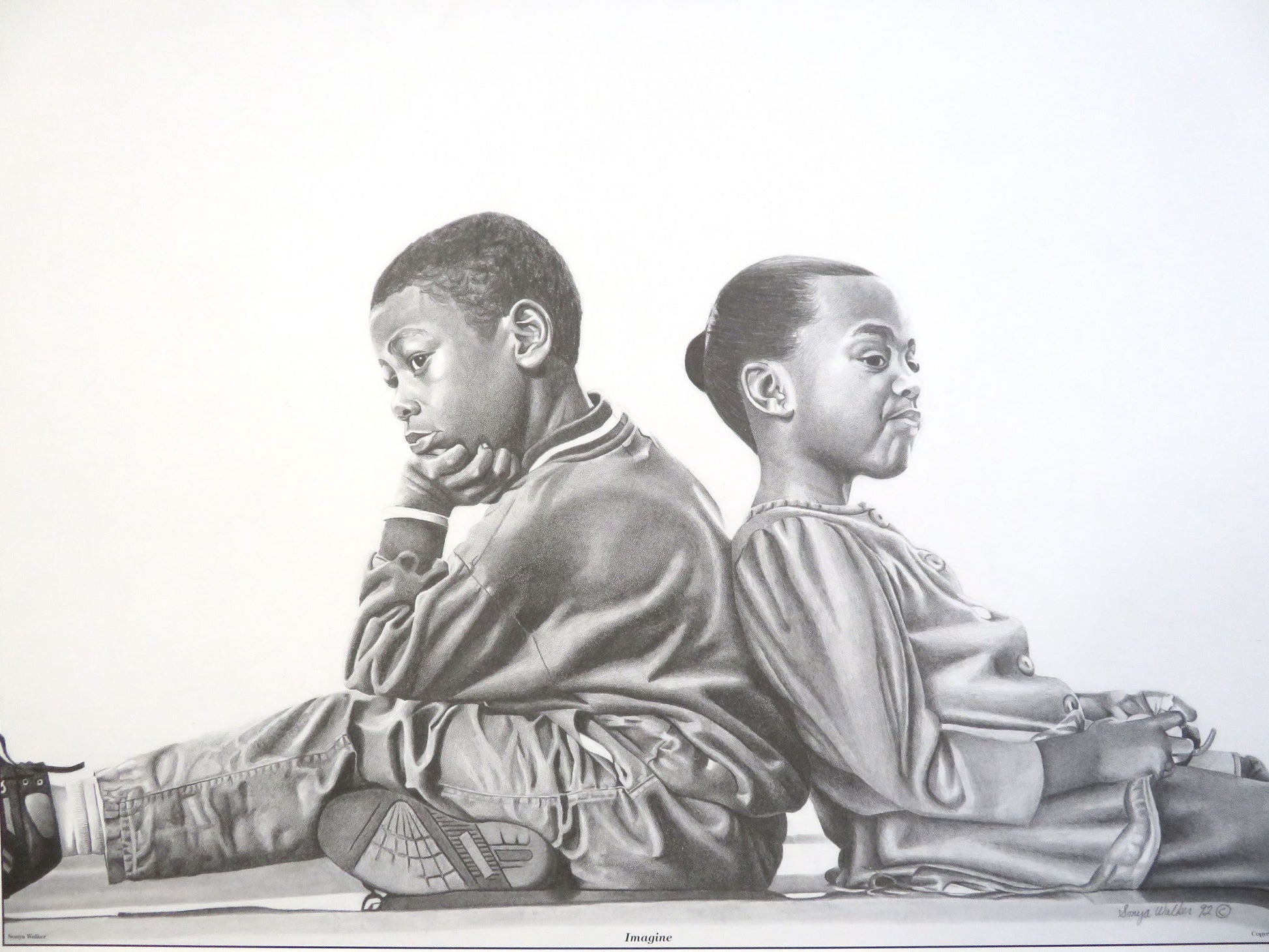 This is a 16 x 20 black and white African American Art Print entitled Imagine. Featuring two children sitting back to back, the image encourages viewers to ponder their future ambitions. This artwork encapsulates the pure and untainted nature of childhood, making it a perfect piece to adorn your living space.